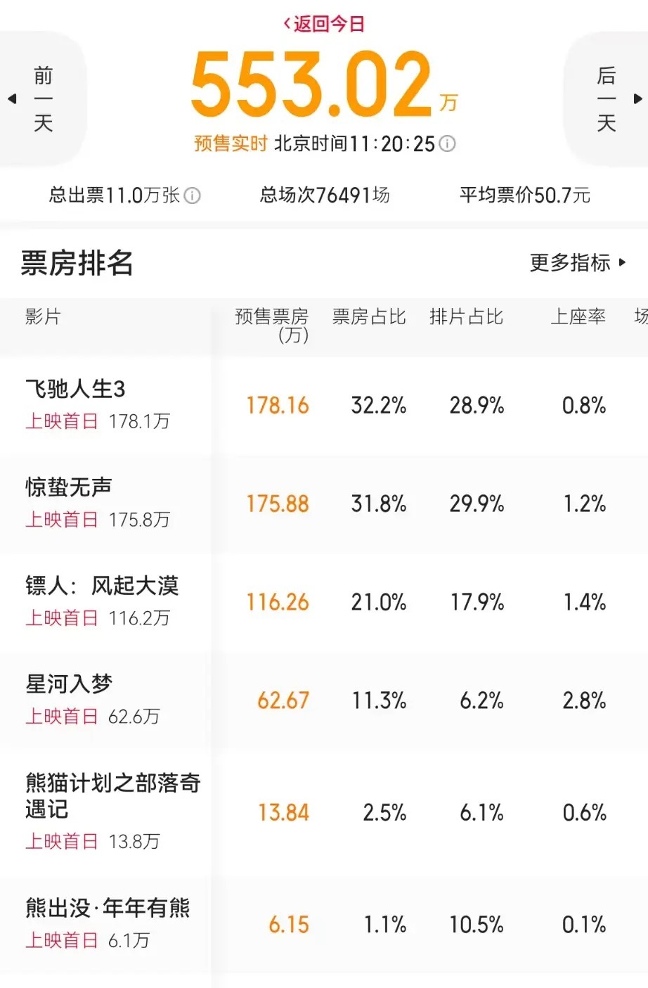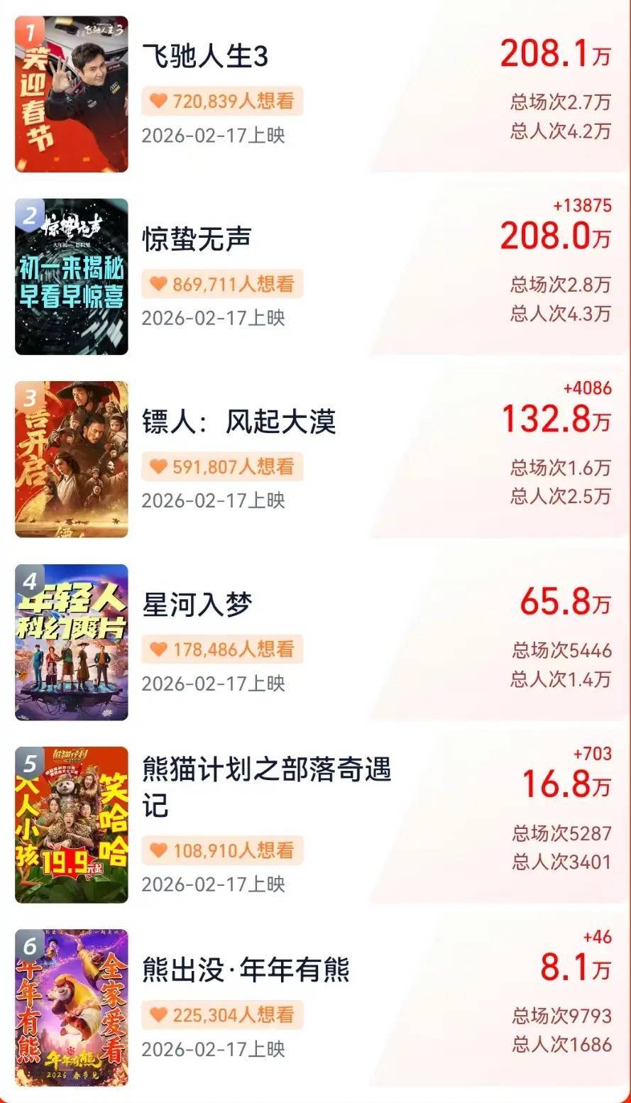 而除了《熊出没》是动画电影受众群迥然相异外,另外五部真东谈主电影题材各有千秋、演员威望势均力敌,正本放到市集上应该契机均等。影院司理们更多是参考导演、刊行方过往收货,以及系列电影的前作发达来决定排片比例。这么一来,就导致《惊蛰无声》和《驰骋东谈主生3》享有极高的票房占比,而《熊猫谋略2》和《银河入梦》独特损失。
