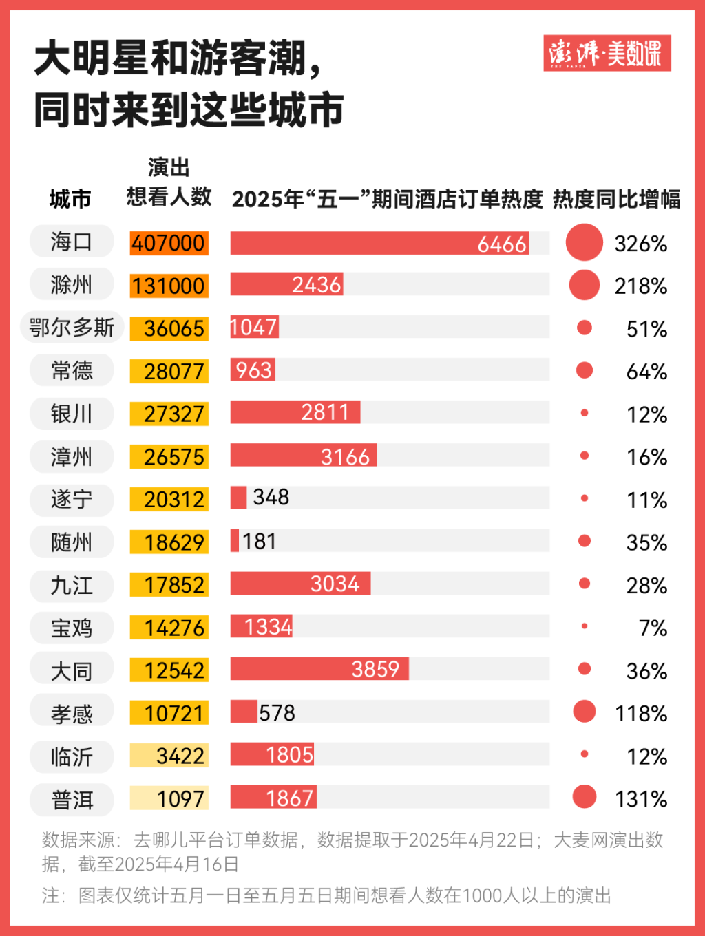 以滁州为例,邀请到陈绮贞、黄贯中、安溥、赵露念念等有名艺东谈主插足音乐节,禁止4月16日,大麦网上该献艺的想看东谈主数约有13万东谈主。比起2024年,滁州“五一”的旅馆订单热度高潮了218%。