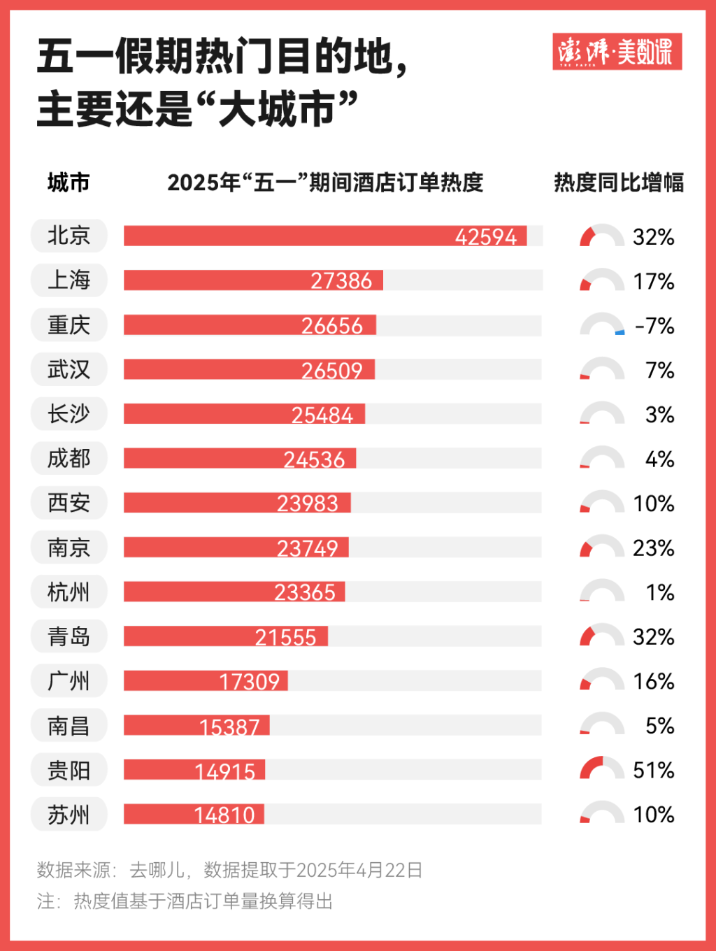去哪儿平台4月22日数据浮现,北京、上海、重庆、武汉等传统热点城市仍是这个“五一”假期最主要的出行方针地,其中涨势最猛的是贵阳,相较2024年“五一”假期,旅馆订单热度增长了51%。