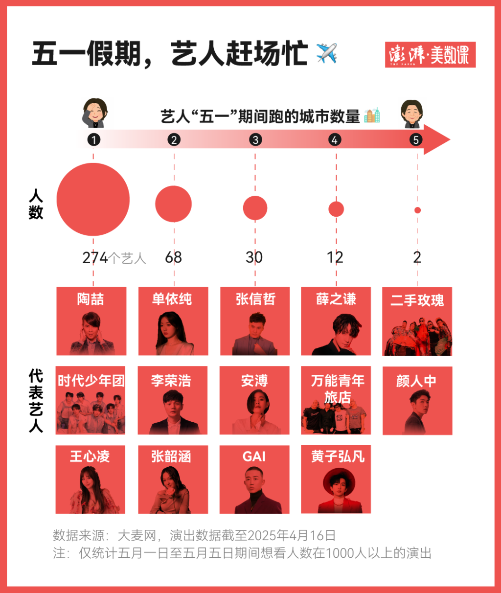 艺东谈主当然是很忙了。“五一”假期参演的艺东谈主,平均每东谈主要去 1.5 个城市。凭《乐队的夏天》走红的摇滚乐队二手玫瑰更是 5 天跑满 5 个城市,航路漫长,终末一日从东部的江苏常州赶往位于中部的陕西宝鸡,险些跳跃半个中国。