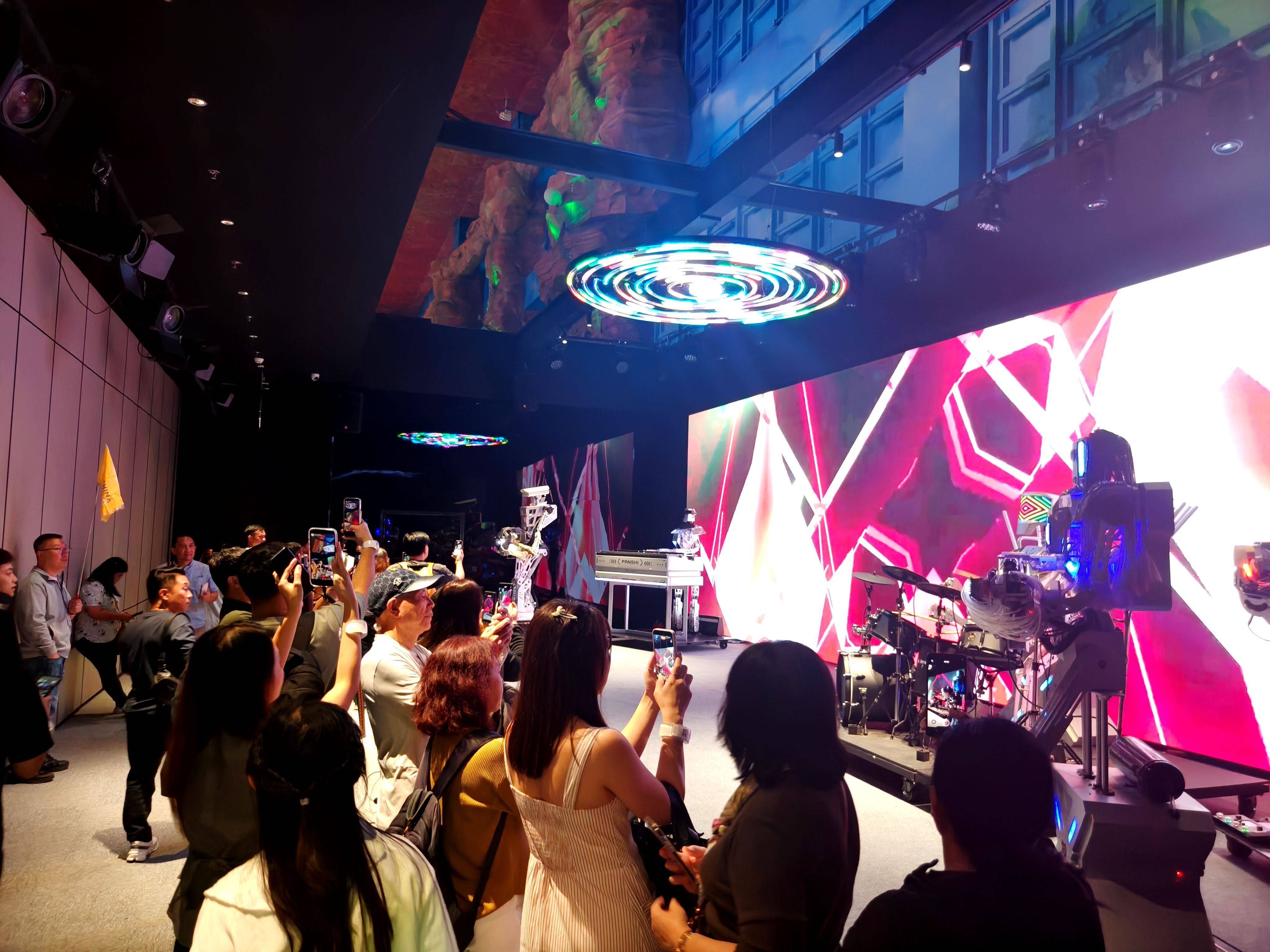 印尼游客们不雅看机器东谈主乐队饰演。