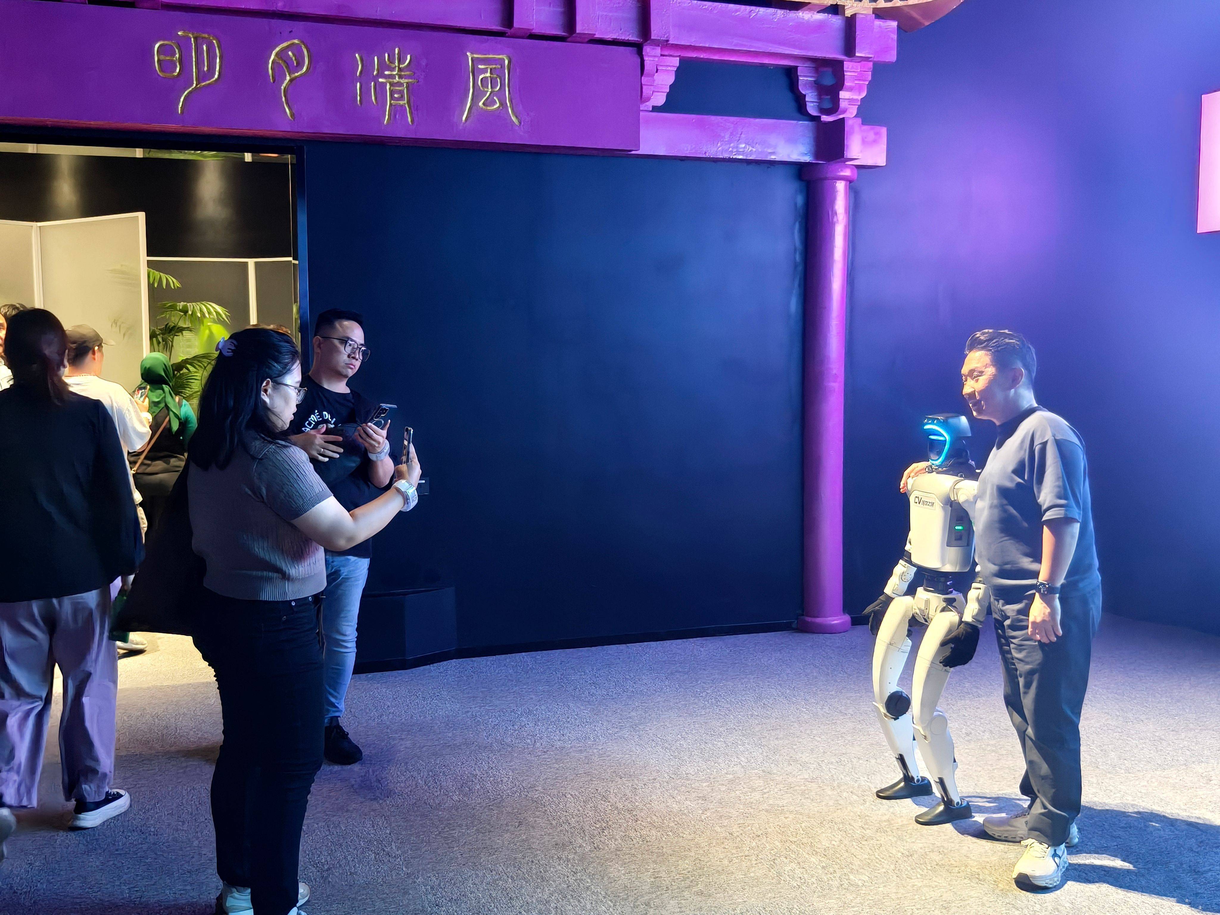 印尼游客们与机器东谈主合影。