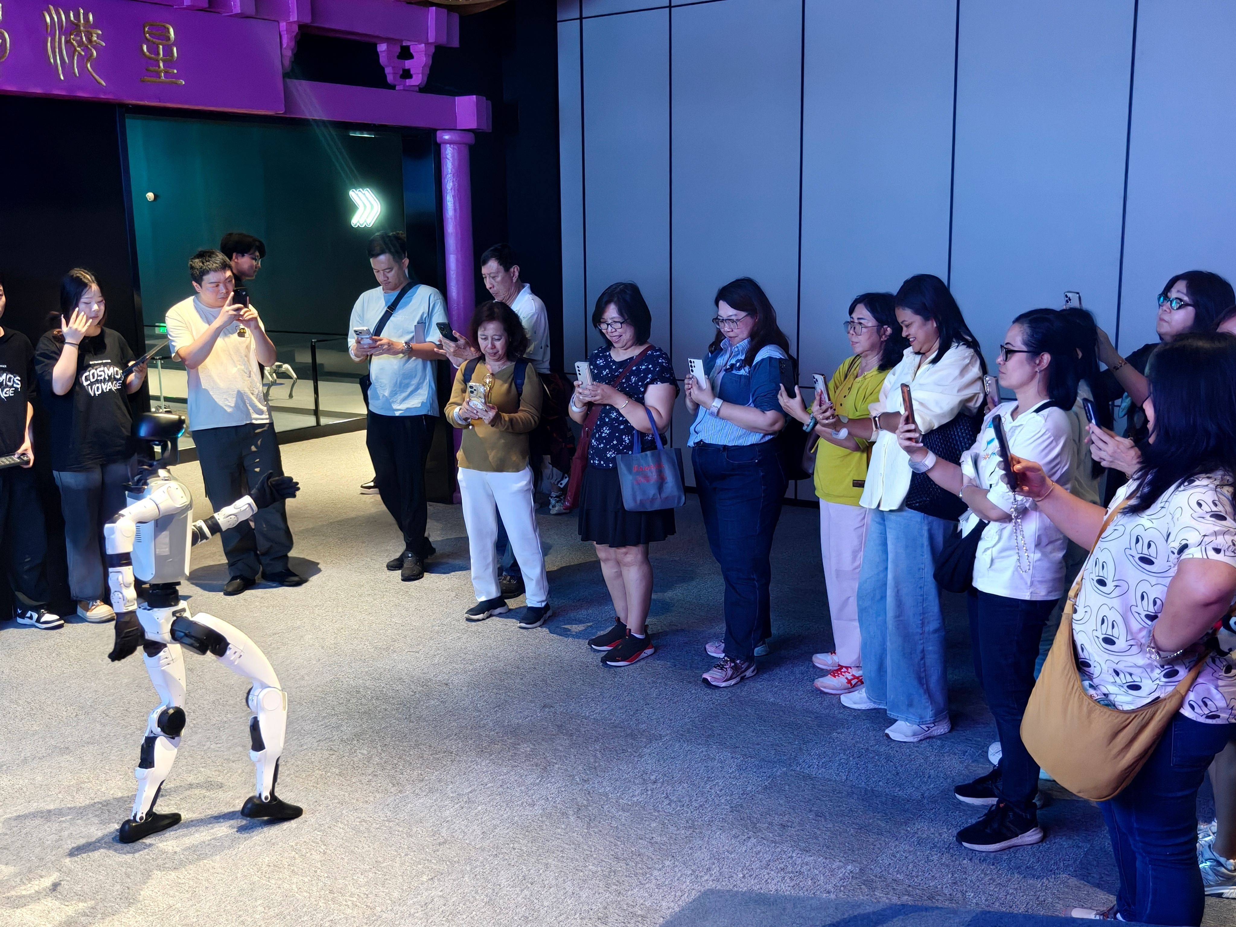 印尼游客们不雅看机器东谈主舞蹈。