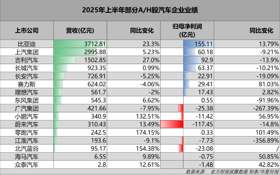 2025年上半年,汽车行业款式接续演变,部分汽车企业事迹呈现出较着分化态势,有东说念主营收、净利润双双杀青增长,有东说念主增收不增利,也有东说念主营收、净利润双双下滑。