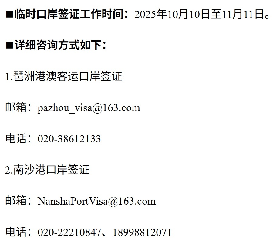 第138届广交会举办技能,广州公安收支境部门在琶洲港澳客运港口、南沙港港口永诀临时开展港口签证责任,为执有广交会相干邀请函件的异邦东说念主签发相应签证,为稳妥签发要求的港澳住户、台湾住户永诀签发三个月一次收支境有用中华东说念主民共和国收支境通行证、三个月一次收支境有用台湾住户商业大陆通行证。