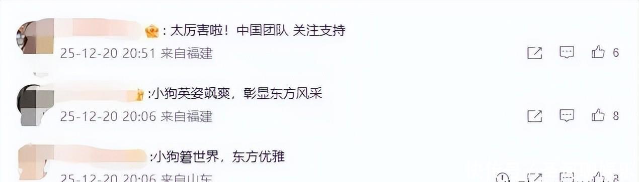 对此,不少网友点赞评叙述:“太蛮横啦!中国团队,矜恤支柱” “小狗意气风发,彰显东方风仪”!