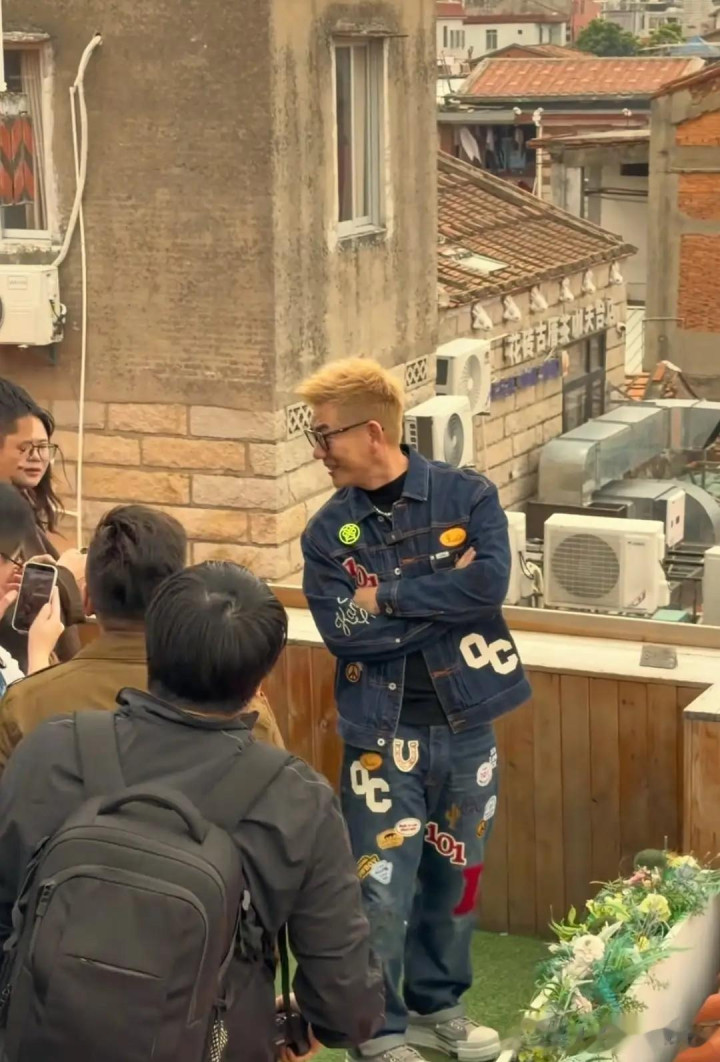 本日他一头亮眼黄发,搭配牛仔外衣+牛仔裤,孤苦幽闲潮装干净利落,走路腰板挺直、门径轻快,脸上没什么疲态,笑起来依旧阳光。
