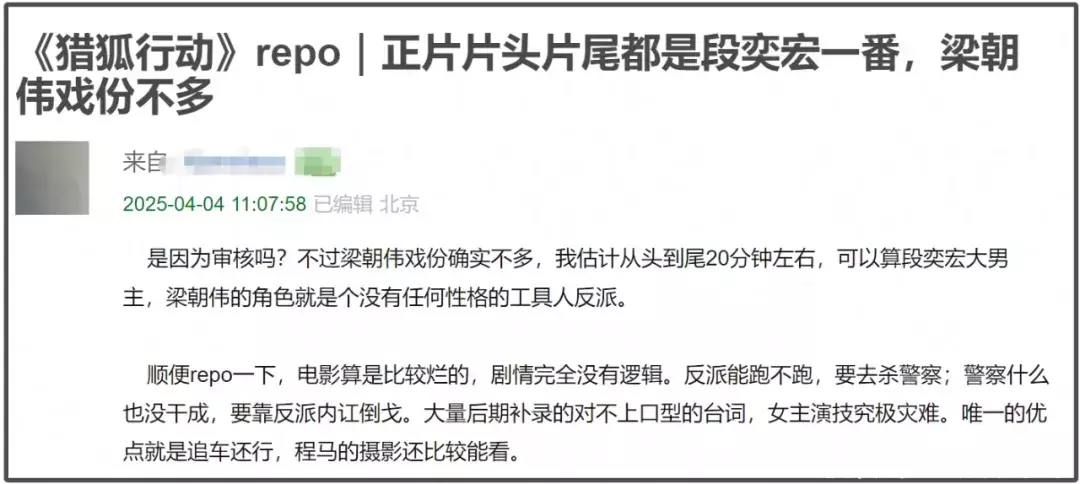 此外,该片固然从新到尾宣传的点都是双男主,但是梁朝伟的戏份却并未几,也就20多分钟。段奕宏成了影片的大男主,而梁朝伟更像是一个映衬大男主高光的邪派器具东说念主,莫得性情,东说念主物特色不显然。