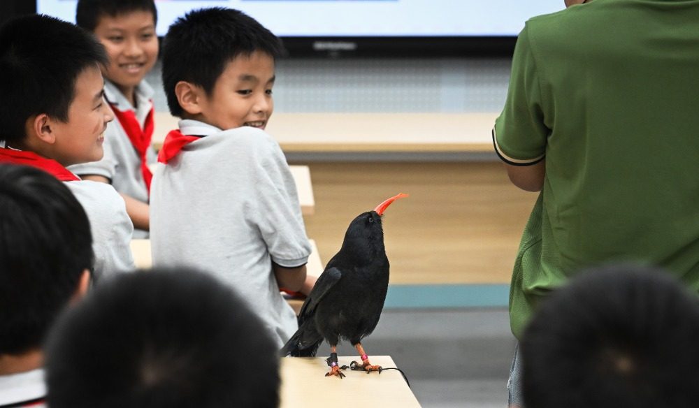 ▲10月11日,沙坪坝区矿山坡小学校,重庆动物园鸟类保育员把红嘴乌鸦带到了课堂上。记者 张锦辉 摄