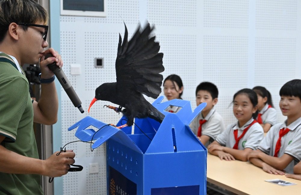▲2025年10月11日,沙坪坝区矿山坡小学校,重庆动物园鸟类保育员带来的红嘴乌鸦意思意思地飞落课桌“听课”。记者 张锦辉 摄