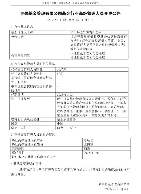 11月3日欧洲杯投注入口,泉果基金不停有限公司发布高等不停东谈主员变更公告,总司理王国斌病逝,由董事长任莉代任总司理职务,任职日历为2025年11月3日。