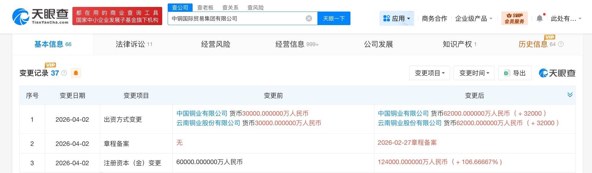 南边财经4月8日电,天眼查工商信息表露,近日2024欧洲杯官网入口,中铜海外生意集团有限公司发生工商变更2024欧洲杯官...